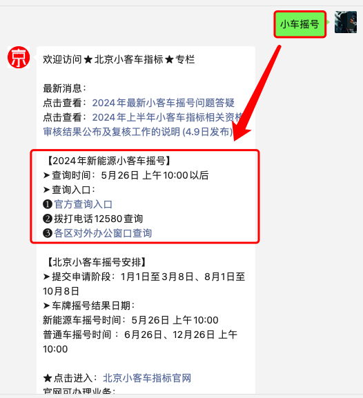 關注【大京事】微信公眾號,在對話框回復“小車搖號”即可獲取最新北京市小車指標申請入口、搖號結果查詢、復查申請、中簽公示等內容。