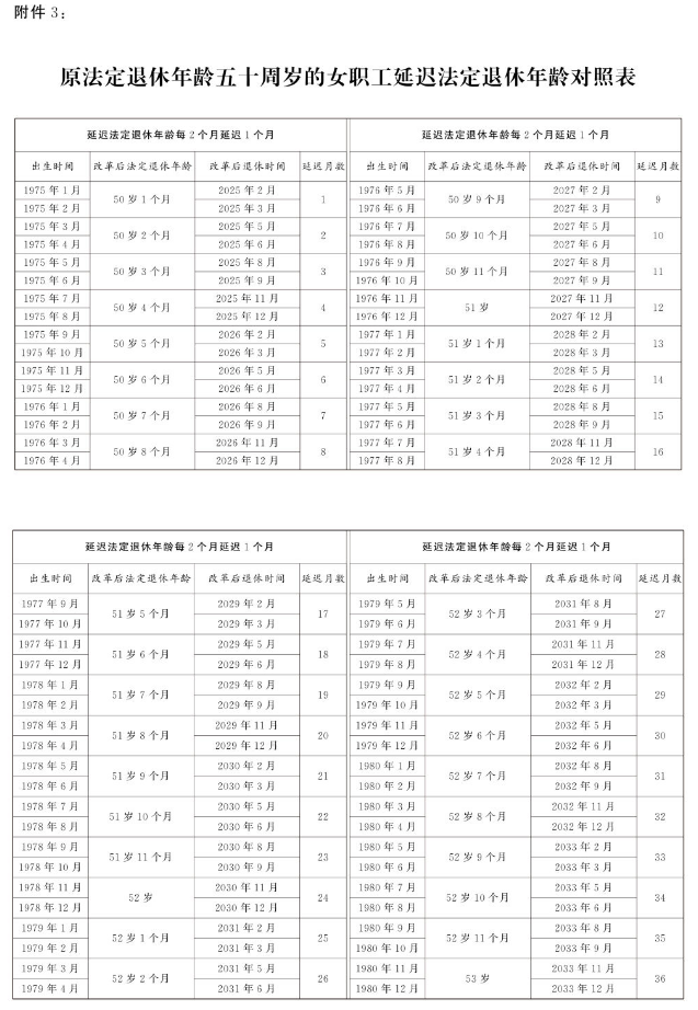 3.原法定退休年齡五十周歲的女職工延遲法定退休年齡對照表