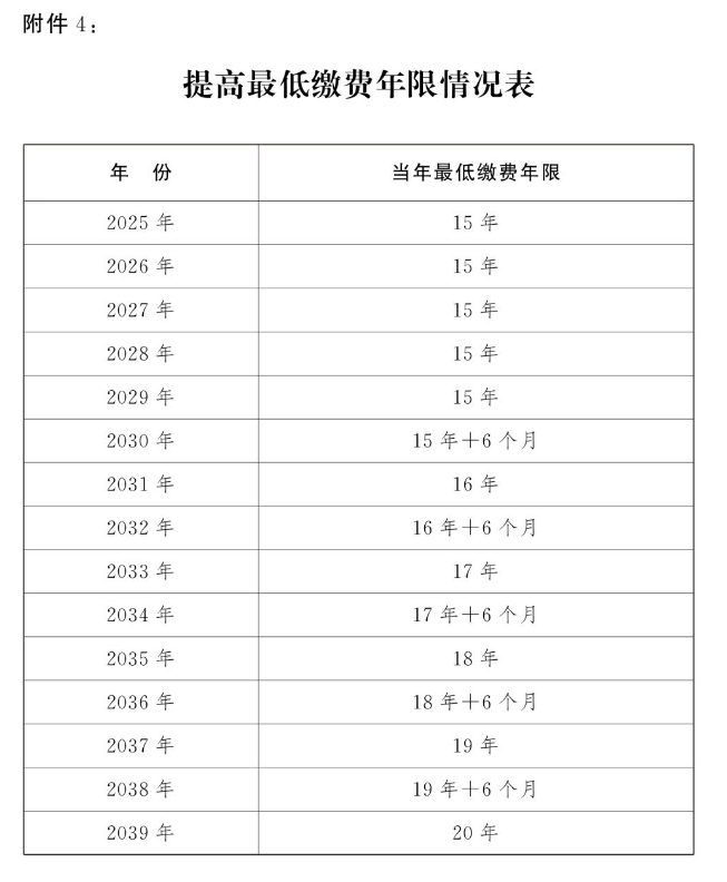 第二條?從2030年1月1日起,將職工按月領取基本養老金最低繳費年限由十五年逐步提高至二十年,每年提高六個月。職工達到法定退休年齡但不滿最低繳費年限的,可以按照規定通過延長繳費或者一次性繳費的辦法達到最低繳費年限,按月領取基本養老金。