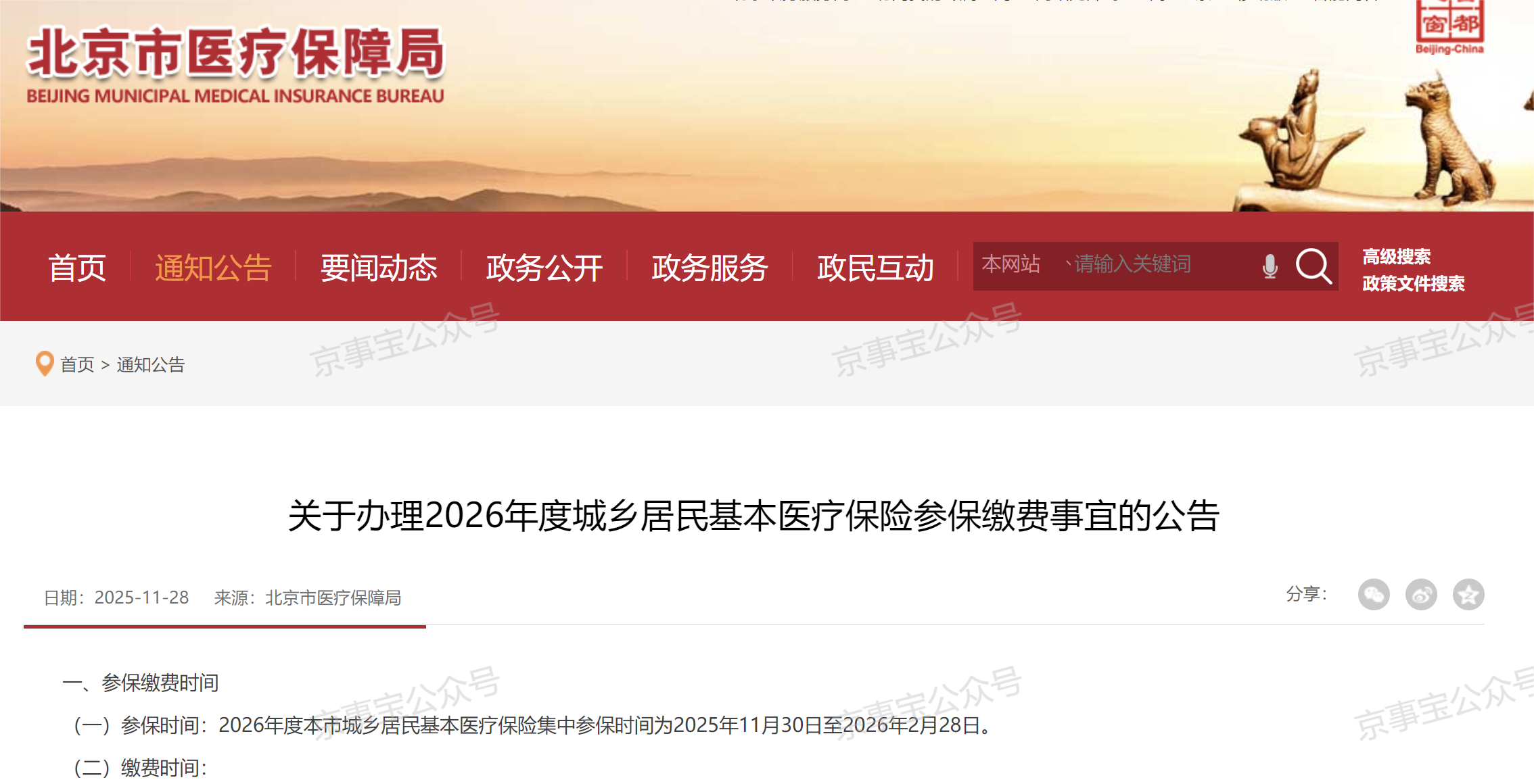 北京市醫療保障局、國家稅務總局北京市稅務局聯合發布《關于辦理2026年度城鄉居民基本醫療保險參保繳費事宜的公告》(以下簡稱《公告》)。公告明確,辦理2026年度本市城鄉居民基本醫療保險參保時間為2025年11月30日至2026年2月28日。