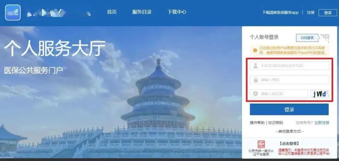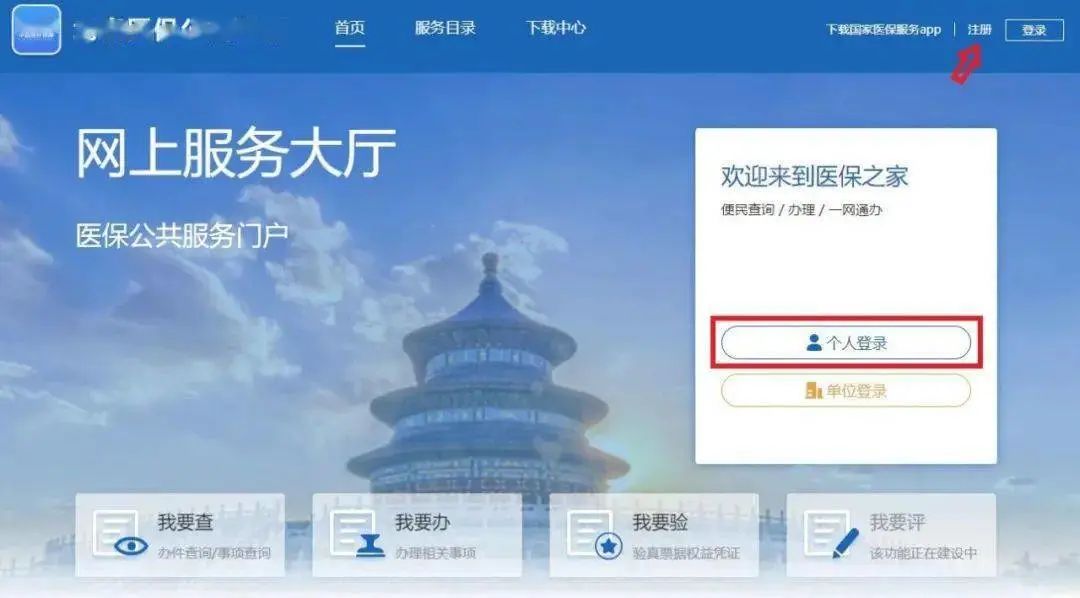 1、登錄“北京醫(yī)保公共服務(wù)”網(wǎng)上服務(wù)大廳,選擇【個人登錄】進(jìn)入個人賬號登錄界面;如您首次登錄,請先點(diǎn)擊【注冊】進(jìn)行個人賬戶注冊。
