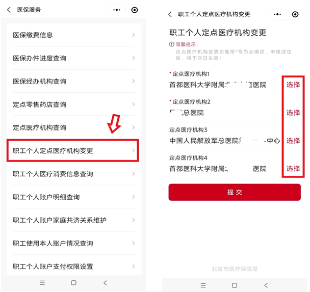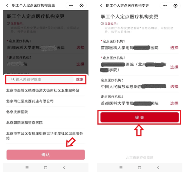 3、點(diǎn)擊需要變更的定點(diǎn)醫(yī)院后,輸入新選定的定點(diǎn)醫(yī)院,更改后點(diǎn)擊【提交】。