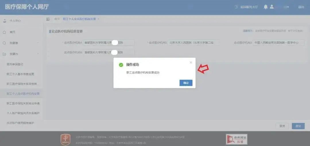 4、提交成功頁面會顯示【職工定點(diǎn)醫(yī)療機(jī)構(gòu)變更成功】,最后點(diǎn)擊“確認(rèn)”完成變更業(yè)務(wù)。