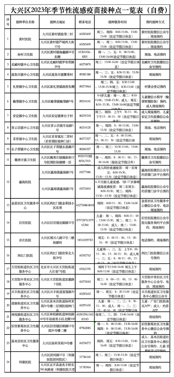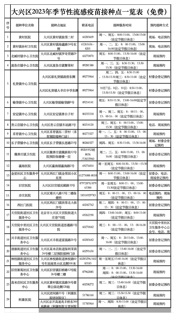 北京大興區(qū)流感疫苗接種門診服務(wù)時間公示來了,具體事宜可咨詢接種門診