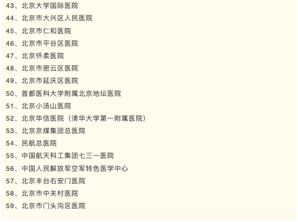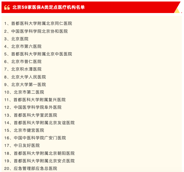 1)截止目前,北京共有59家A類定點(diǎn)醫(yī)院,可以不用選直接報(bào)銷。